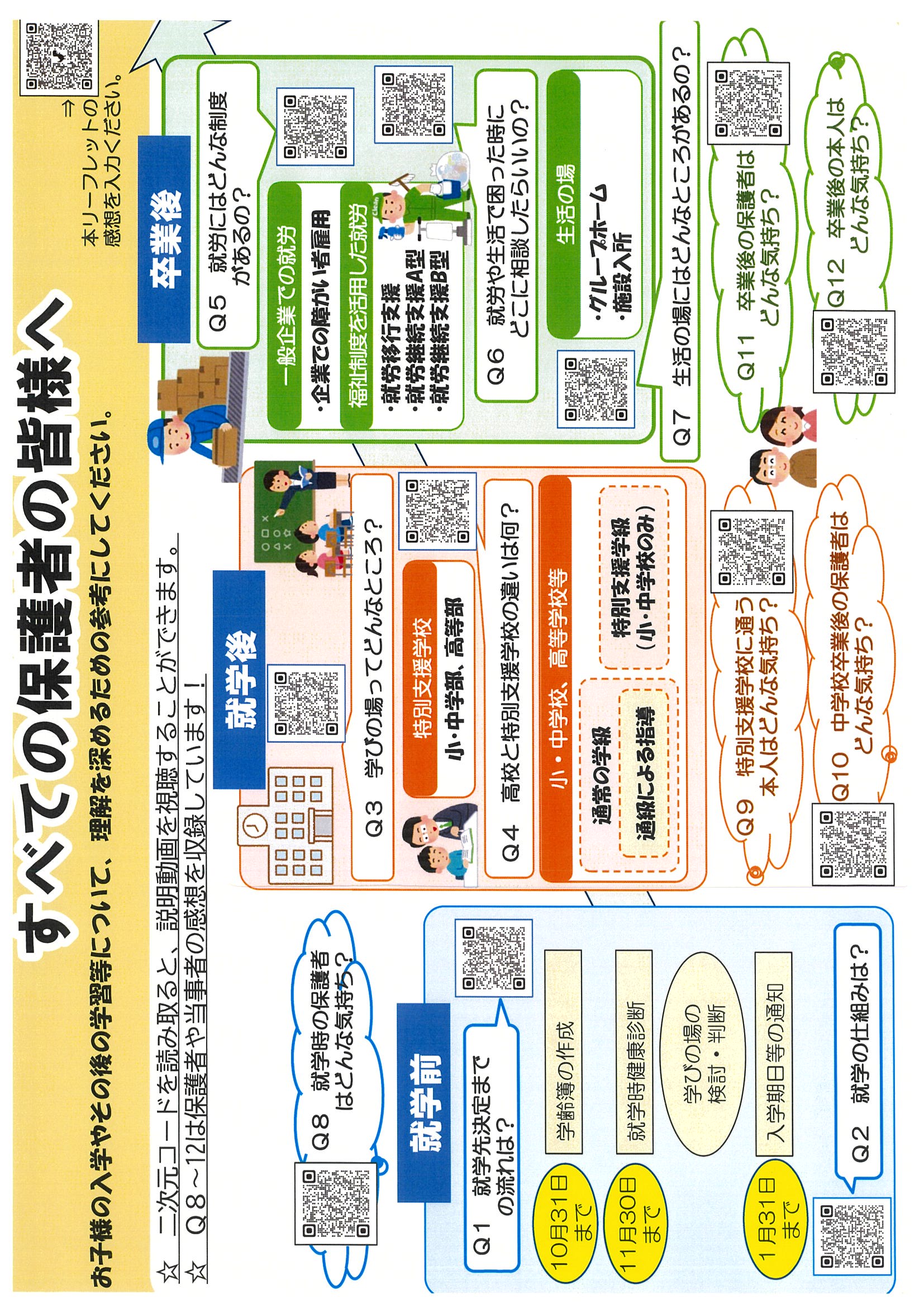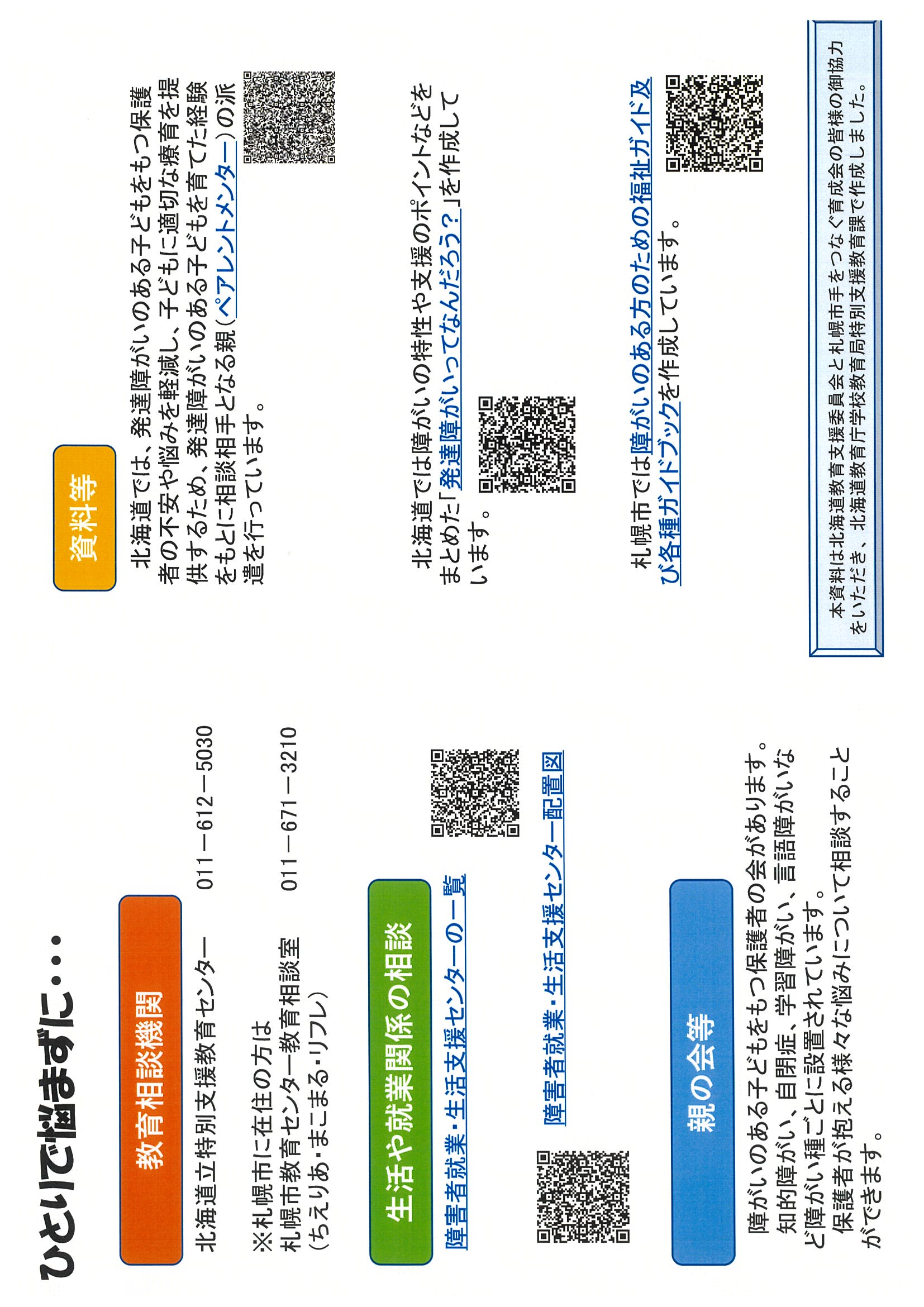 このたび、札幌市子ども未来局を経由して、北海道教育庁より保護者向けリーフレット「すべての保護者の皆様へ」の配布についての周知依頼がありました。 これは、障がいのある子どもをもつ保護者を含め全ての保護者に、就学の仕組み、小学校等や特別支援学校などの学びの場とそこでの学習、学校卒業後の就労などについて理解を深めるとともに、障がいのある子ども自身やその保護者の気持ちを知っていただくことを目的に、作成されたものです。是非、ご一読ください