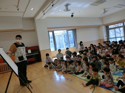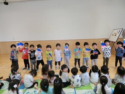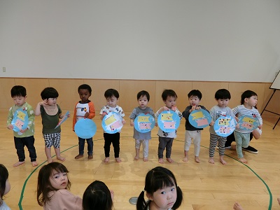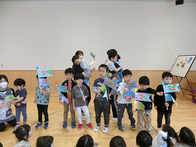 4月26日に子どもの日の集いをしました! 保育士から子どもの日の由来を聞いた後に“こいのぼり”をみんなで歌いましたよ♪ 最後は各クラスで作ったこいのぼりをみんなの前で紹介しました! どれもとても素敵なこいのぼりでしたよ☆