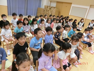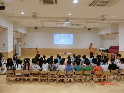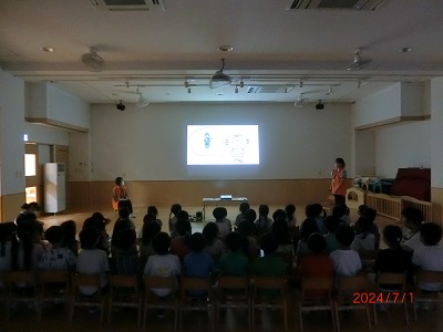 7月1日に春の交通安全教室を行ないました。 指導員さんをお招きして、道路の交通ルールや駐車場でのお約束などを教えていただきました。 クイズなども交えたスライドショーでの説明にみんな興味津々でしたよ! 交通指導員の皆さん、お忙しいなか貴重なお話、ありがとうございました!