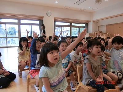 8月20日に8月生まれのお友達の誕生会をしました。 小さなお友達が多く、緊張気味の様子でしたがみんな頑張ってインタビューなどに答えていましたよ☆ 保育士の出し物は様々な食べ物が出てくるパネルシアターでみんな大喜びでした。