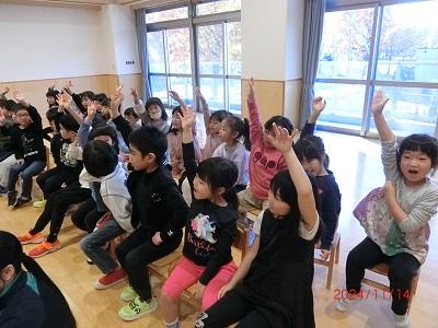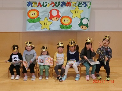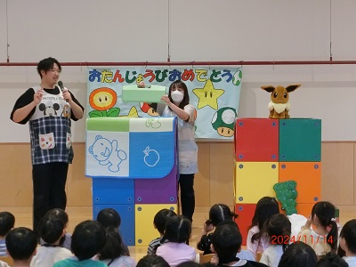 11月14日に11月生まれのお友達の誕生会を行ないました。 たくさんのインタビューや歌のプレゼントでお祝いしました! 緊張気味のお友達もいましたが、みんなの前に立つことができていて、とてもがんばっていました☆ 保育士の出し物は壁の間を通るものが何かを当てるクイズでした! みんな、「なんだろう」「あっ、○○だ!」などとワイワイ言いながら考えていましたよ♪