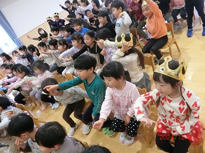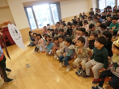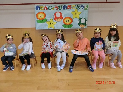 12月5日に12月生まれのお友達の誕生会をしました。 みんなでたくさんのインタビューやお歌、カードのプレゼントをしてたくさんお祝いしましたよ☆ 保育士の出し物は手品ショーでした! かわいいおばけの登場や空中浮遊のマジックにみんな大喜びでしたよ♪