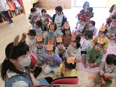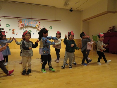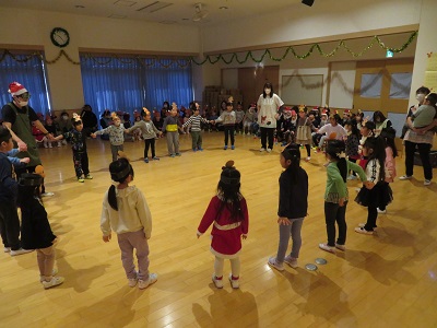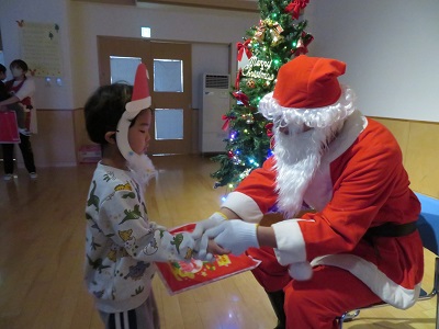 12月24日にクリスマスの集いをしました。 各クラスこの日のために、ダンスやベルなどの出し物の練習をしてきました。 たくさんの歌などでみんなでお祝いをしていると、サンタさんが登場! プレゼントをもらってとても思い出に残る一日になりました。 サンタさん、本当にありがとうございました!