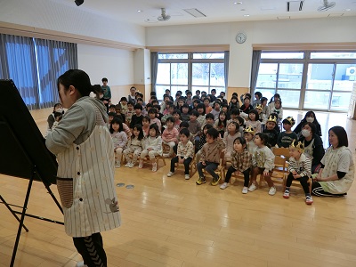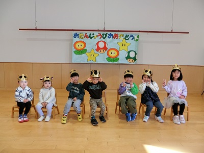 1月23日に1月生まれのお友達のお誕生会を開催しました。 たくさんのインタビューや歌でお祝いしましたよ♪ 保育士の出し物はお絵描きクイズ! 透明な紙に様々な絵を描いて重ねると、いろんなイラストになりとても盛り上がりました☆
