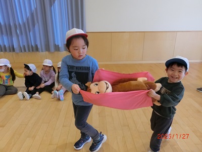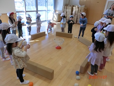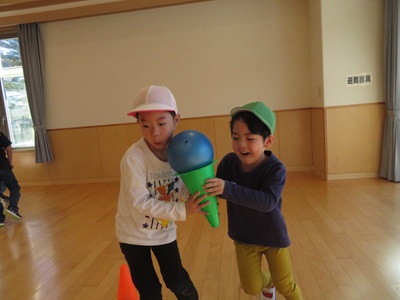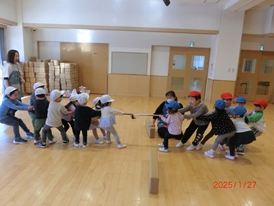 1月27日、28日にホールで運動会ごっこをしました! 園庭での雪中運動会を行う予定でしたが、地面が凍っていたのでホールで様々な種目を楽しみました。 リレーでは車を引いたり、ボールやぬいぐるみを運んだりと異年齢のお友達で力を合わせてがんばりましたよ! 他にも玉入れや綱引き、宝探しと一緒にたくさんの競技を行いました♪ 終わった後は、ミカンを食べて嬉しそうな笑顔のみんなでした☆