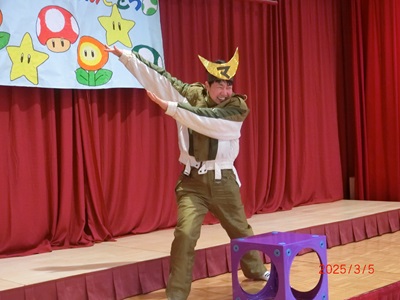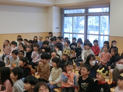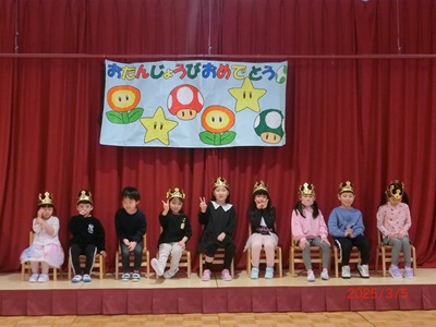 3月5日に3月生まれのお友達のお誕生会をしました。 誕生児さんにみんなでインタビューを行い、歌やカードのプレゼントでたくさんお祝いしましたよ♪ 保育士の出し物はヒーローショーでした!様々な場所から現れる怪人と戦う姿をたくさん応援していましたよ☆