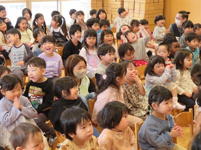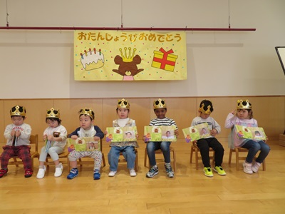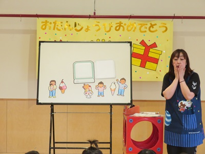 4月10日に4月生まれのお友達の誕生会をしました。 7人のお友達にインタビューやカードのプレゼントを行い、たくさんお祝いしましたよ☆ お誕生日の歌もみんなで大きな声で元気一杯に歌いました♪ 保育士の出し物はパネルシアターでした! ダジャレがたくさん出てくる面白いお話しでたくさんの笑い声が響きました☆