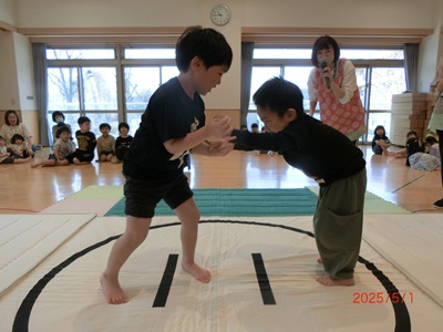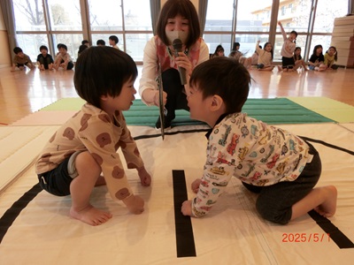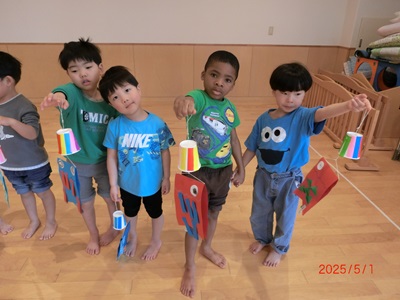 5月1日に子どもの日の集いをしました。 お部屋で作ったこいのぼりをもって集まり、クラスごとに紹介しました! みんなで一緒にこいのぼりの歌も大きな声で歌いましたよ♪ その後、各クラス毎におすもう大会!みんな力いっぱい楽しんでいました☆