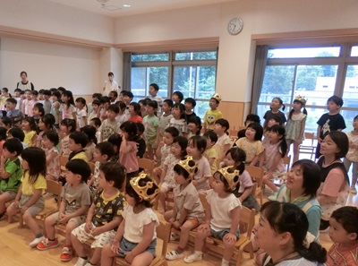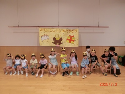 7月3日に7月生まれのお友達の誕生会をしました! たくさんのお友達が大きな声でインタビューをして、お祝いしましたよ☆ カードのプレゼントや歌などもとても喜んでいました♪ 保育士の出し物はマジックショーで、みんなとても集中して見て、大きな歓声があがっていました!