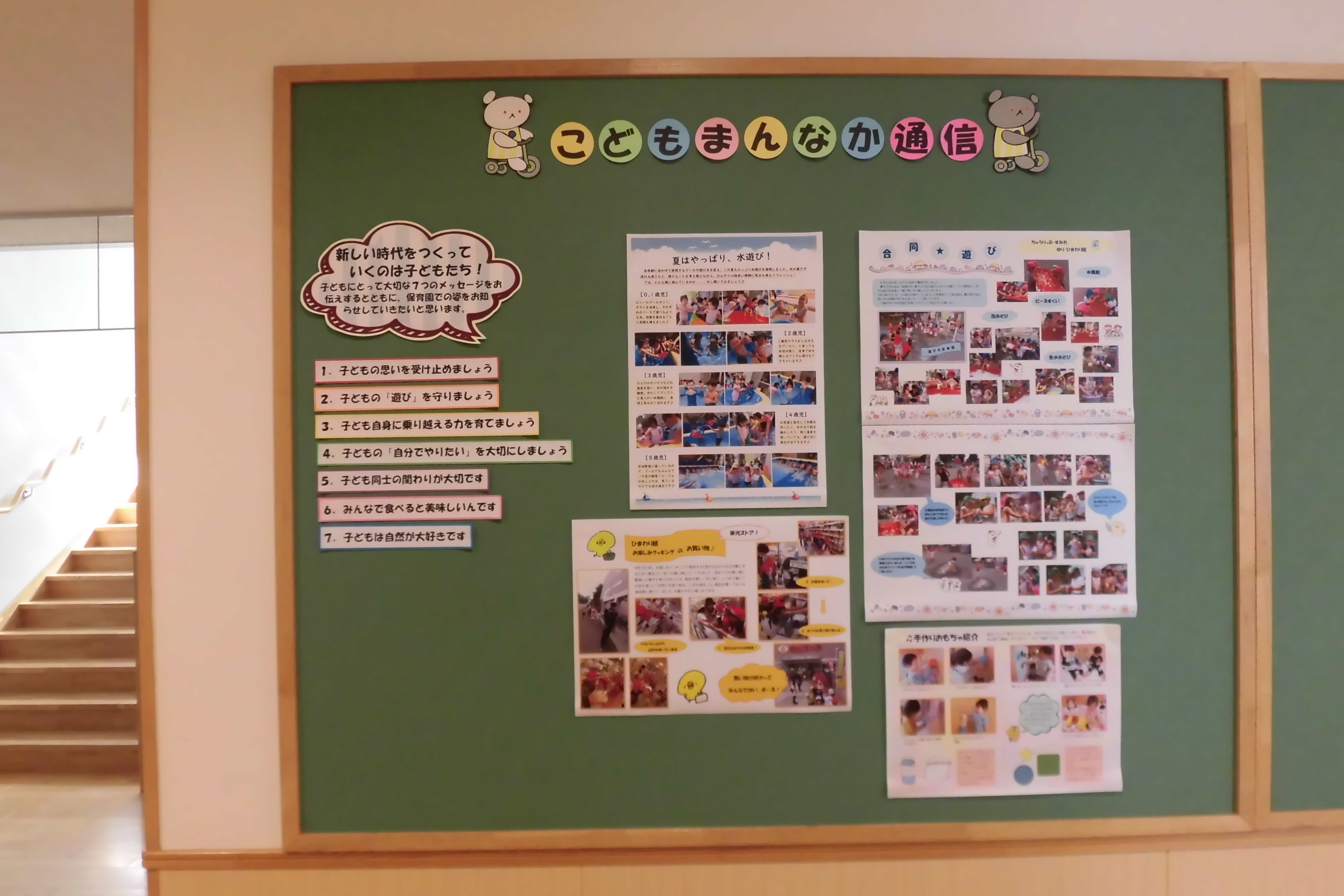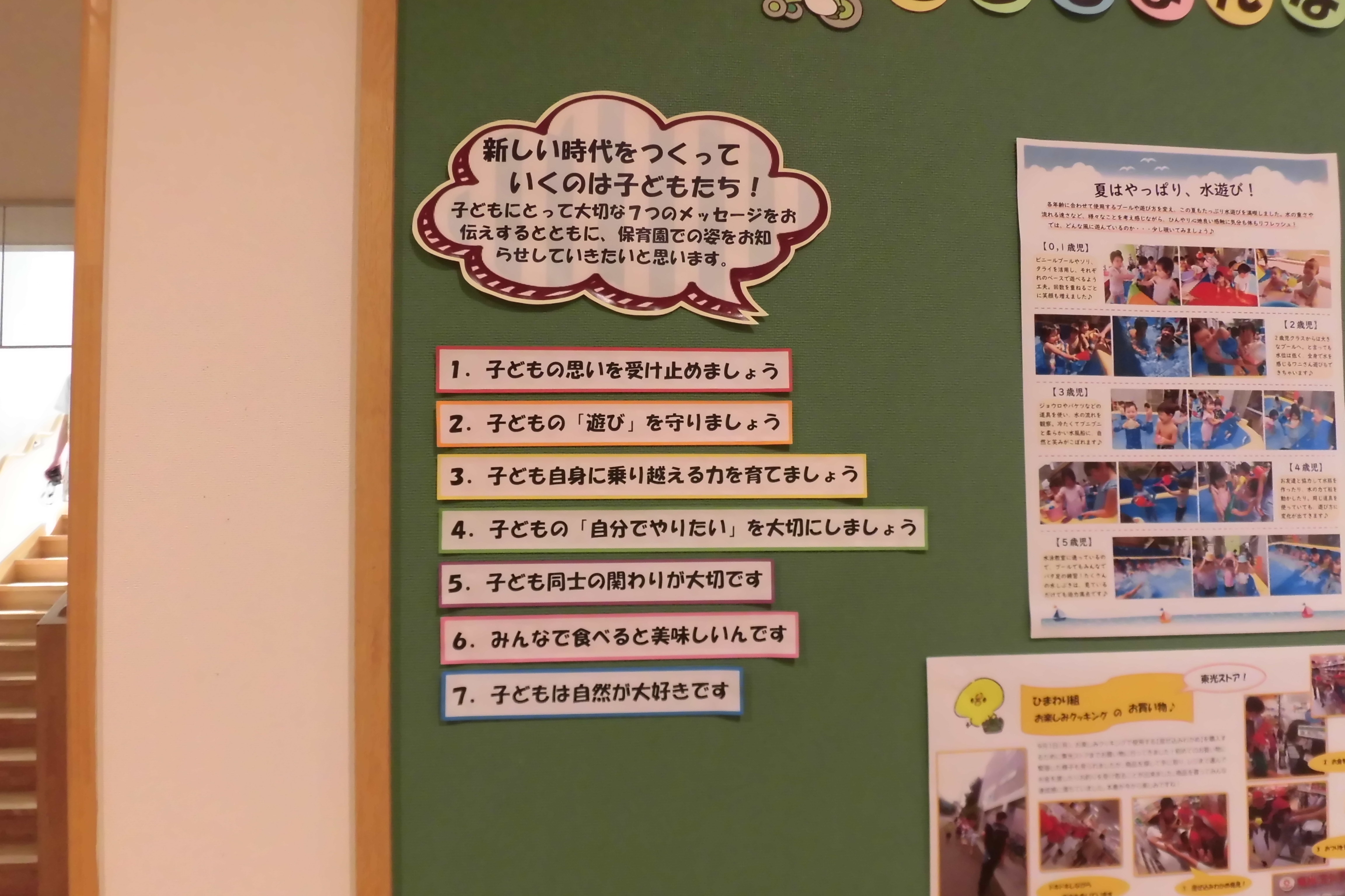 真駒内保育園では、“こどもまんなか社会”への実現に向けた、7つのメッセージに沿って園内での保育の取り組みに工夫を凝らしてチャレンジし、その様子を『こどもまんなか通信』として、お知らせしてまいります。 まだ、スタートしたばかりで試行錯誤中ですが、色々な保育の様子を“見える化”して保護者の皆様に提供していきたいと思いますので、ご意見ご要望等ございましたら、保育士にぜひ声をかけてください。