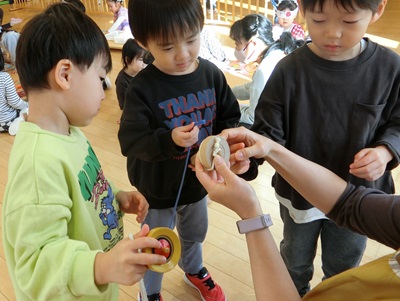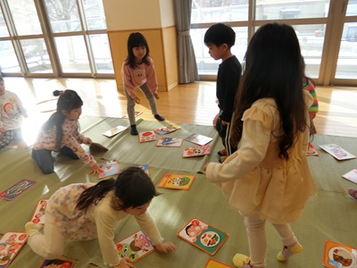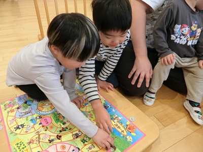 保護者・ご家族の皆様、本年もどうぞよろしくお願いします。 1月5日(月)に新年ご挨拶のお集まりをしました。 みんなで「明けましておめでとうございます!」と元気いっぱいにご挨拶をしましたよ! その後は羽子板、コマ回し、すごろく、福笑い、カルタとお正月ならではの遊びをたくさん遊びました! 2026年も元気一杯に過ごしていきたいと思います!