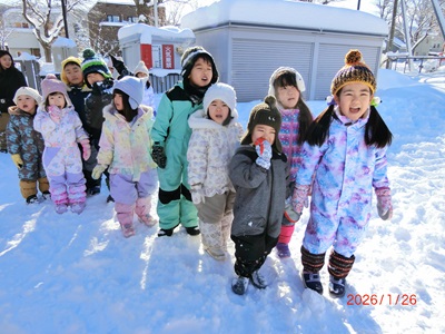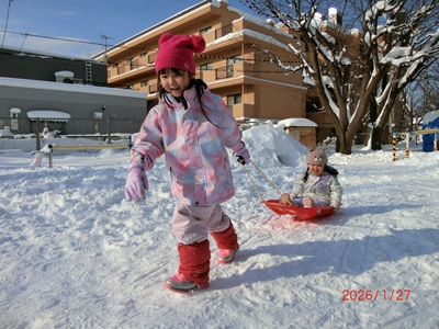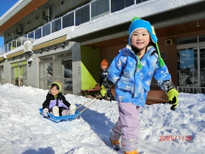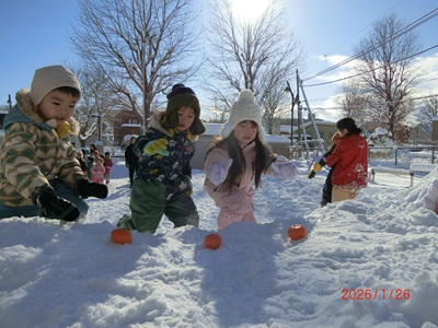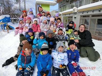 1月26日と27日に、雪中運動会を行いました。 2クラスで一緒に園庭で楽しみましたよ! そり引きリレーでは大きいお友達が、小さいお友達をソリに乗せて雪山の周りを走りました! ミカン探しも行い、雪山の上などにあったミカンに向かって全力でダッシュ! 終った後はみんなで一緒にミカンを食べましたよ☆