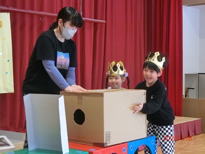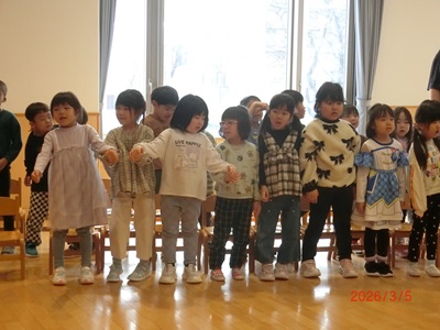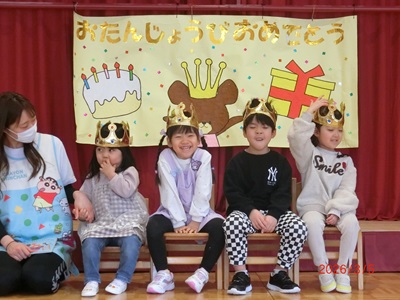 3月5日(木)に3月生まれのお友達の誕生会を行いました。 今回の誕生会では1つのインタビューにお誕生児さんみんなで答えていましたよ♪ その後、歌やカードのプレゼントをしてお祝いしました! 保育士の出し物は空気砲の実験!誕生児のお友達も叩いて的を倒していました☆