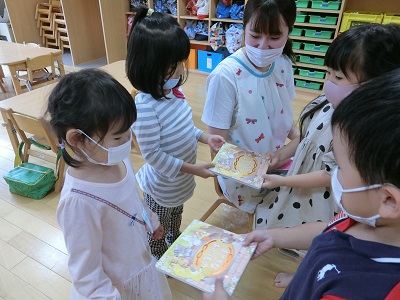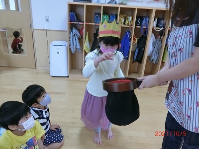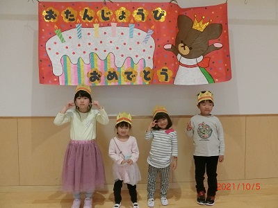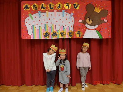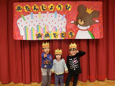 10月5日に10月生まれのお友達の誕生会を行ないました! 先月の誕生会を欠席していた誕生児のお友達も一緒に写真を撮りましたよ。 全体では集まっていませんが、各お部屋で手品の出し物を楽しんだり、カードのプレゼントやインタビューを行い、みんなとても喜んでいました!
