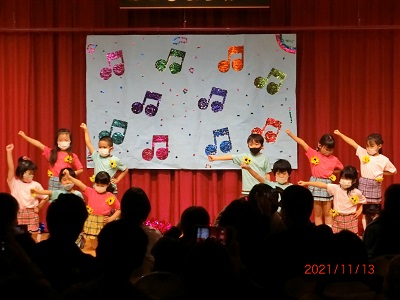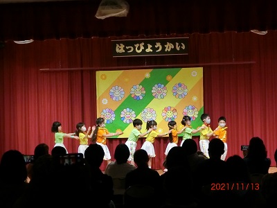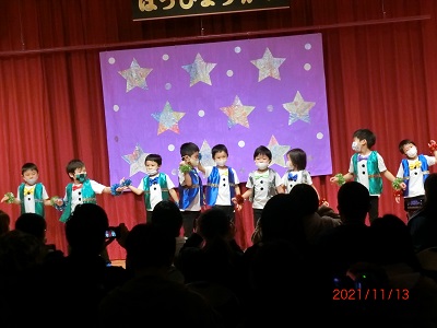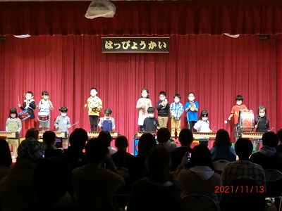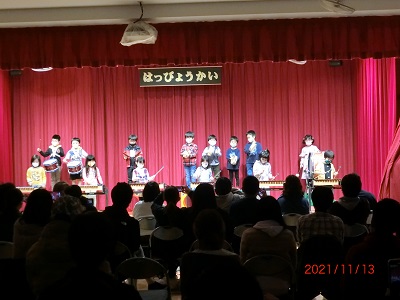 11月13日(土)に、発表会を行ないました。 今年の発表会は、新型コロナウイルス感染対策のためにひまわり組のみの開催となりました。 子どもたちは日々、楽器や踊りなど、本番に向けてたくさんの練習と努力を積み重ねてきました。 当日も衣装に着替え、やる気に満ちた表情を見せていたひまわり組の子どもたち。 ステージ上では、28人全員がこれまでの練習の成果を十二分に発揮し、輝いていました。