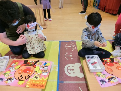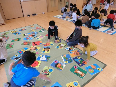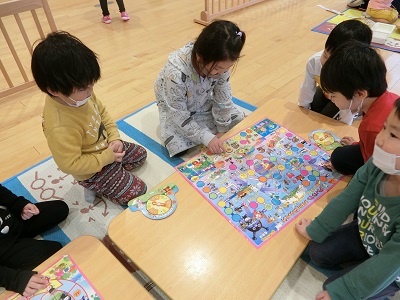 1月4日に保育園が開園し、みんなで新年のご挨拶をしました。 保育士と一緒に「明けましておめでとうございます!」と元気な声を響かせた子ども達です☆ その後はお正月遊びを用意して、みんなで遊びました! コマ回し、すごろく、福笑い、カルタ、羽根つきといったお正月ならではの遊びをたくさん楽しみましたよ! 今年も一年間、元気いっぱいに過ごしていきたいと思います☆