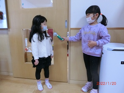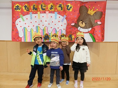 1月20日に1月生まれのお友達の誕生会をしました。 ホールで記念撮影をした後、それぞれのお部屋でお祝いしましたよ! カードのプレゼントをしたり、インタビューをしてみんな大喜びでした! お休みしていた1月生まれのお友達は、今後の誕生会で一緒に写真を撮ろうと思います。