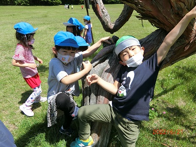 7月21日にゆり組、ひまわり組で真駒内公園に行ってきました。 歩く距離は少し長かったですが、みんなとっても頑張って歩いていましたよ☆ 違うクラスのお友達とも一緒に広い公園の中で思いっきり体を動かして、遊びました! 昼食はコロナウイルス警戒のため、お部屋に戻ってからお弁当を食べました。