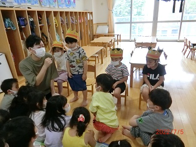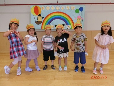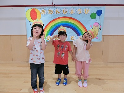 7月5日に7月生まれのお友達の誕生会をしました! タペストリーの前に集まって、みんなでポーズ☆ 6月の誕生会をお休みしていたお友達も一緒に写真を撮りましたよ。 みんなとっても素敵な笑顔を見せてくれました! 今回もお部屋に戻ってから、クラスのお友達にたくさんお祝いしてもらいました☆