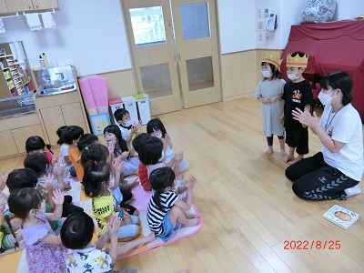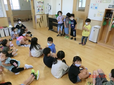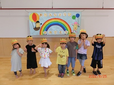 8月25日に8月生まれのお友達の誕生会をしました! お祝いのタペストリーの前でみんなでポーズをきめて記念撮影をしましたよ! その後、お部屋に戻り、インタビューやカードのプレゼントをしてたくさんお祝いしましたよ☆