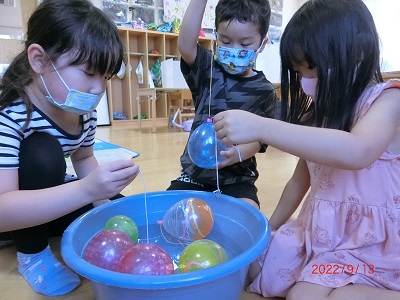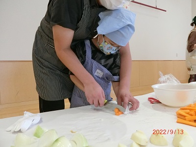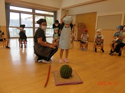 9月13日にひまわり組さんがお楽しみクッキングをしました。 カレーライスの材料を順番に保育士と一緒に切りましたよ! 保育園では初めて使う包丁に少し緊張気味でしたが、みんなとても上手に切ることができていました☆ 給食さんに調理してもらったカレーライスも美味しくたべましたよ♪ 他にも、スイカ割りをしたり、みんなで作ったグライダー飛ばしたり、ヨーヨー釣りをしたり、ととても充実した一日になりました。
