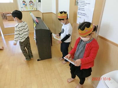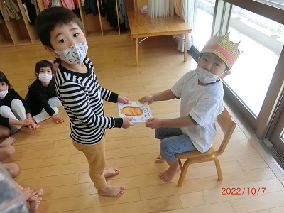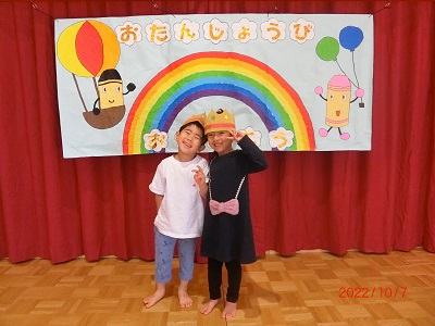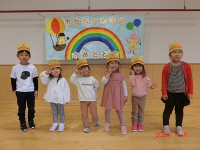 10月6日に10月生まれのお友達の誕生会をしました。 ホールにタペストリーを用意して、誕生時のお友達の記念撮影をしましたよ! その後、各クラスに戻り、インタビューやカードのプレゼントをしてみんなでお祝いしました☆