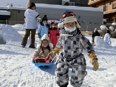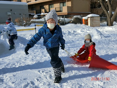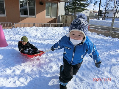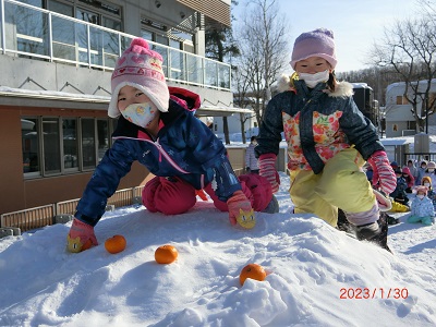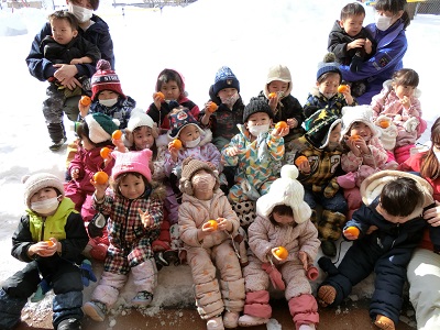 1月30日、31日に園庭で雪中運動会をしました。 それぞれ2クラス一緒に、雪の上で思いっきり体を動かしましたよ! お兄さんお姉さんが小さい子をソリに乗せてリレーをしたり、雪の中からミカンを探してお部屋で食べました! 楽しい冬の思い出ができました,ね☆