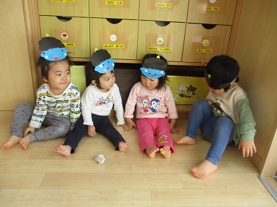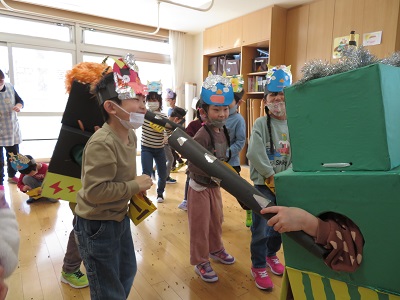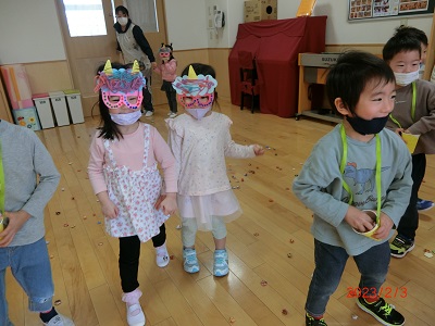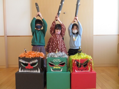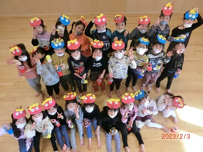 2月3日に節分の豆まきをしました。 各クラスでそれぞれ鬼のお面を作り、お部屋の中で豆に見立てた紙などを撒きました。 年長さんのひまわり組は、ダンボールで作った大きな鬼に変身して、本物の大豆を使って豆撒きをしました! どのクラスもとても盛り上がりながら、季節の行事を楽しんでいましたよ。