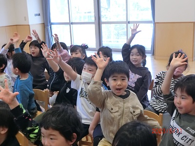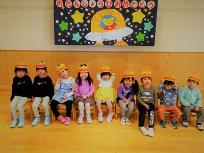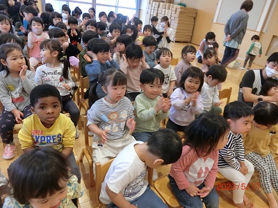 5月11日に5月生まれのお友達の誕生会を行ないました。 ホールに集まってお友達の前でインタビューやカードのプレゼントをしてもらい大喜びの子ども達! 保育士の出し物のシルエットクイズもとても楽しんで参加していましたよ☆