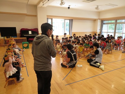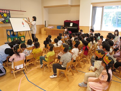 6月20日に6月生まれのお友達の誕生会をしました。 みんなで誕生児のお友達にインタビューをしたり、カードや歌をプレゼントしたり、とたくさんお祝いしましたよ。 保育士のパネルシアターもみな大喜びで好評でした!